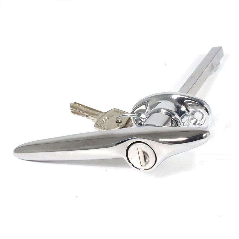 Plain T boot handle approx 108mm, escutcheon hole centres 36mm, chrome plated. Available locking only. 8mm square shaft