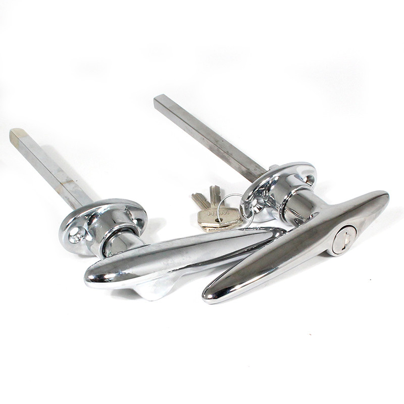 Locking chrome plated swept type door handle, supplied in PAIRS only to suit left and right of vehicle. Escutcheon hole centres 36mm, Matched key sets.