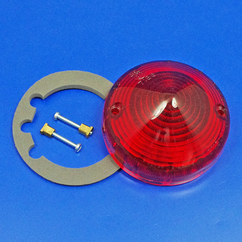 Red lens kit for Lucas L691/2 rear lamps. "E" Marked. Diameter 83 mm. Applications include Austin Healey, Hillman Imp, AC Cobra, Morgan. Lens, screws, brass blocks and gasket.