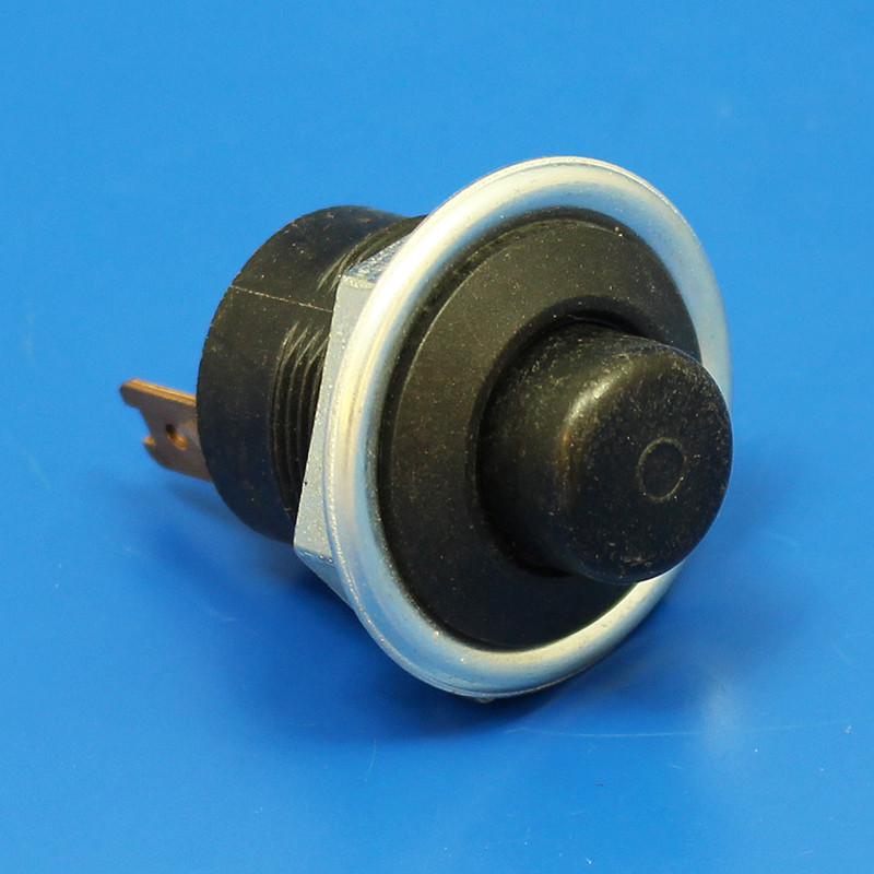 Push button (spring loaded) black knob, 22mm diameter chrome bezel, short type for metal dash. Maximum dash thickness 7mm. Requires 19mm hole. Makes contact when pushed. Equivalent to Lucas switch type SS5, 31107, SPB105, 31967. Originally available in Black ( part number 413), Ivory (part number 413-IV, equivalent to Lucas part number 31272) and Brown (Lucas part number 31107)