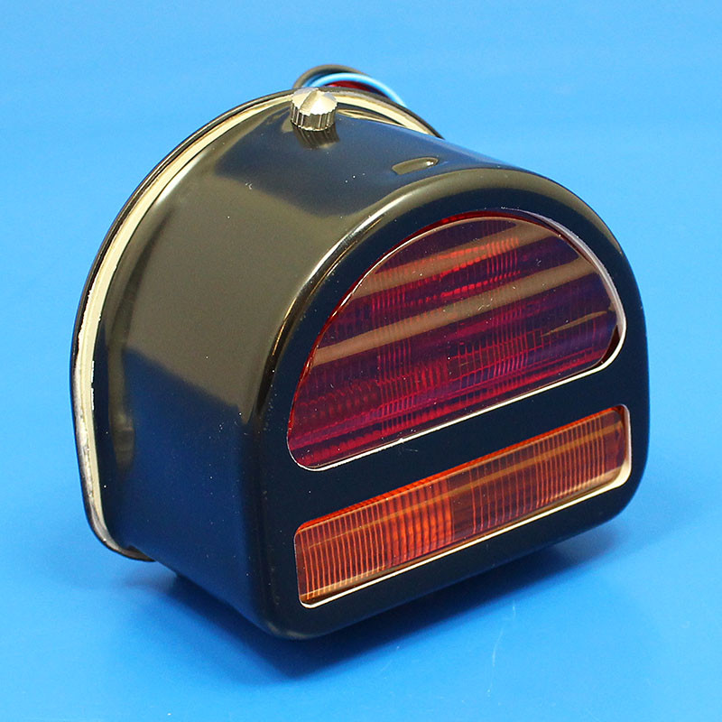 Rear 'D' lamp, equivalent to the original Lucas ST51 type lamp, though converted for combined stop, tail, number plate illumination and indicator/turn signal function. Now available in 6V and 12V. Supplied as standard with conventional incandescent bulbs - please indicate your required voltage with the drop down box below. There are also LED options that operate with 6, 12 and 24 Volt - please see information below regarding B117LEDWW-A (6 and 12V number plate), B921LEDW-A (6 and 12V indicator) and B383LEDWW or B381LEDWW (6 and 12v stop and tail). Body 87mm wide x 75mm tall x 54mm deep, backing base plate 95mm wide x 84mm tall. These high quality reproduction lamps feature a steel body and back plate with a new moulded split RED and AMBER main plastic lens, plus CLEAR side lens. Two single contact WEDGE T10 capless bulb holders - for Number Plate illumination and Indicator function - and one BA15D holder for 'Stop' and Tail function. We offer this lamp in a choice of black paint or chrome plated finish, both with side number plate illumination window. Supplied complete with 2 x capless T10 base bulbs - 1 x 5w number plate illumination light and 1 x 21W indicator - and 1 x BA15D 21/5w 'stop' and tail. For spare 6V bulbs - please see B501-6V for number plate, B921-6 for indicator and B3214A/B3214-equal for stop and tail. For spare 12V bulbs - please see B501/B501-12V for number plate, B921/B921-12V for indicator and B3212A/B3212-equal for stop and tail. For LED upgrade bulbs please see 'Related Products' below - part numbers B117LEDW-A, B921LEDW-A and B381LEDW which will work with 6, 12 and 24V systems, noting you may need an LED flasher unit e.g. LEDFLASH3 Video comparison of incandescent wedge bulb version and LED panel version. --