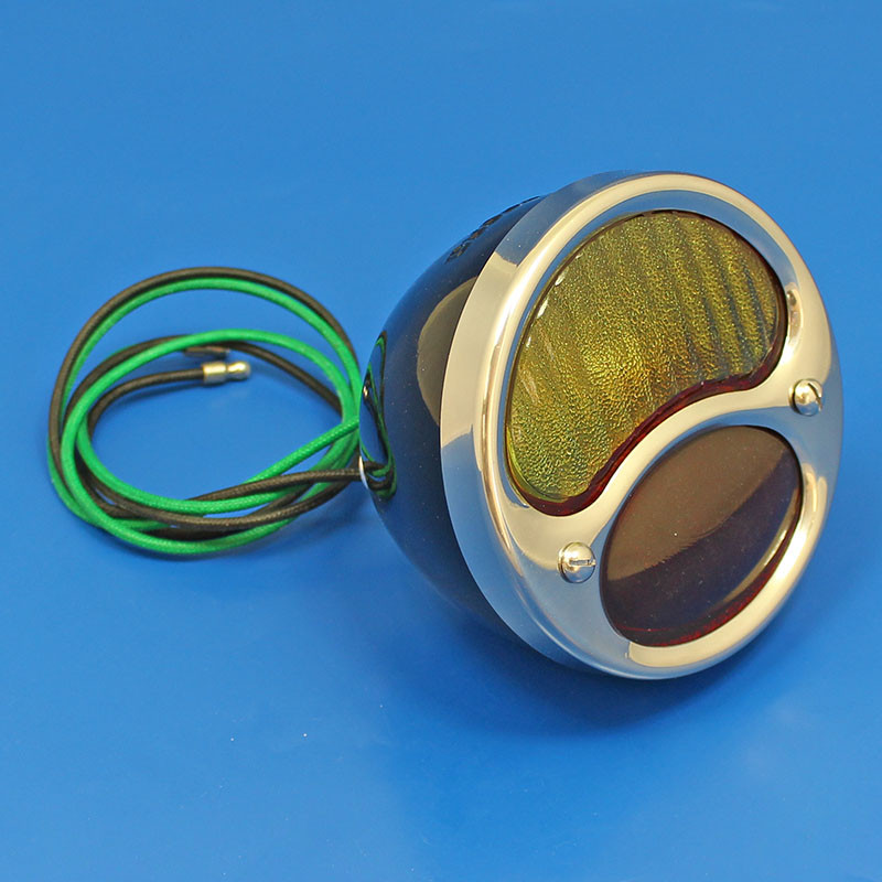 Gloss black powder coated round lamp housing with highly polished stainless steel rim. Excellent quality all red and amber split glass lens. 12V bulbs included as standard. Vintage style cloth braided green and black nylon coated wires. Green wire is stop, black wire is tail, metal housing is earth. 97mm diameter x 51mm deep. Two BA15S single contact bulbholders fitted through back, mounting screw hole centres 45mm. Uses BA15S bulbs, B317 (6v) indicator B205 (6v) side light or B382 (12v) indicator B207 side light. These lamps can be upgraded with part number 211-CONV which converts the bottom bulb holder to a double contact BAY15D fitting - allowing use of a twin filament bulb behind the lower red section of the main lens, providing stop, tail and number plate light functions, leaving the upper amber section for indicator/turn signal function for red/amber lensed lamps. For red/red lensed lamps, either the tail or stop function can be doubled up with the extra filament.