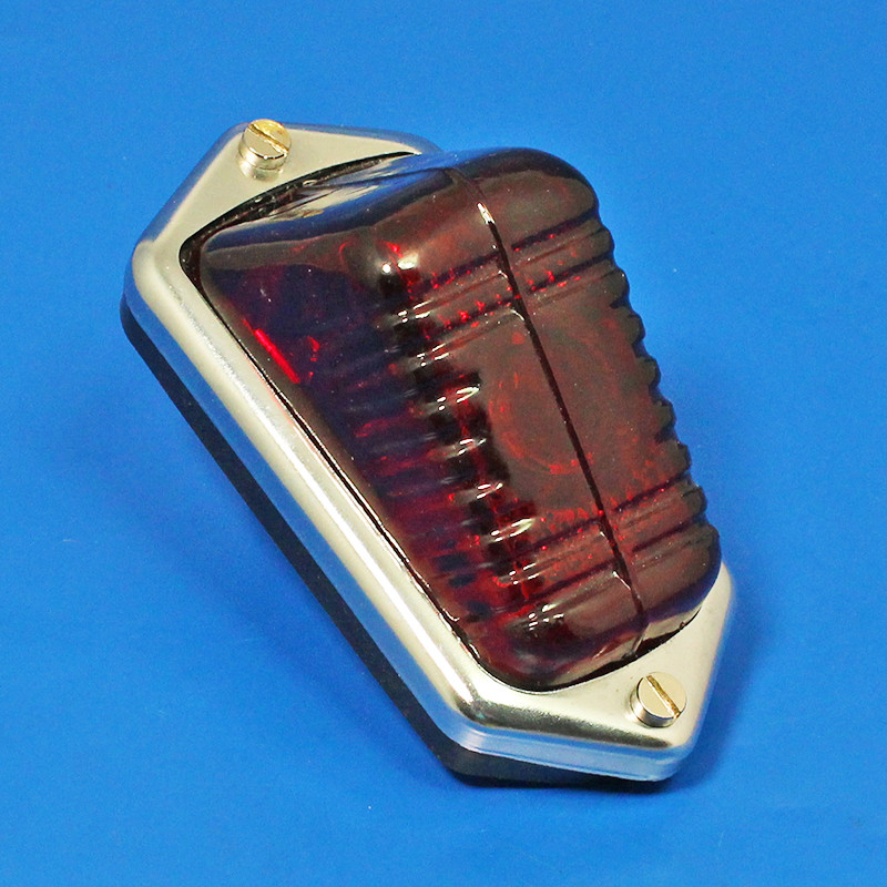 Legal version of our very popular vintage lamp equivalent to the Lucas 582 type with stop, tail and side number plate illumination functions. Large red plastic lens 55mm diameter, body 58mm long x 42mm diameter, overall length 92mm. Double contact BA15D equal pin bulbholder. Mounts though 20mm panel hole. Offered in black coated, nickel or chrome plated finish. Uses a BA15D bulb. For conventional bulbs please see our B383 (6v) or B381 (12v), or for LED options please see CSTLEDWWR-6 and CSTLEDWWR-12, designed with this lamp in mind. --