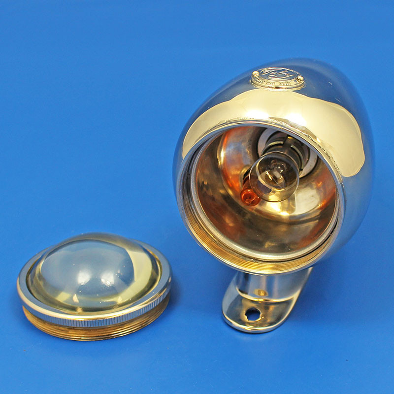 Internally modified torpedo style sidelamp, reproduction of the Lucas 1130 type. Chromium plated on brass body approx 100mm long x 46mm diameter. Clear plastic lens held with screw in top, the internals of this lamp have been modified to accept two individual modern (WEDGE T10 base) bulbs which provide a clear side light and an amber flashing light, mounted by two bolts in base. Rubber mounting pad supplied. 12 volt bulbs supplied only - for spare bulbs please see our B921 and B501