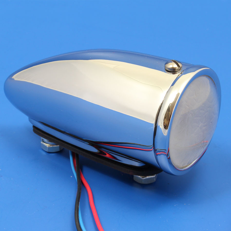 Streamline Torpedo-style side/wing lamp. Reproduction of the Lucas 1130 type side lamp. Chromium-plated brass body approximately 100mm long x 46mm diameter. Frosted glass lens with chrome rim retained by a screw in top. Mounted by two bolts in base. Rubber mounting pad supplied. Fitted with chrome on brass 'Toby' medallion, as applied to our finest early lamp and mirror recreations. Toby Mitchell - London NW1' is the mark Vintage Supplies has applied to its authentic reproductions of selected early CAV and Lucas pattern lamps and mirrors for over 30 years, continuing the manufacture and development of John Mitchell's high-quality 'Toby' branded product range. Double filament BA15D bulb holder - allows combined side and flasher bulb to be fitted; please see new combined white/amber LED bulbs as well as twin filament white incandescent bulbs. For bulbs, please see part numbers B383 (6v) or B381 (12v) or CSILEDW and CSILEDWW, all listed as related products below. We now also offer a Toby reproduction of the 1142 type side lamp originally made by Lucas, a pedestal mounted torpedo lamp that is larger than the 297/1130 type - available as a sidelamp 1142S or sidelamp/indicator 1142IND