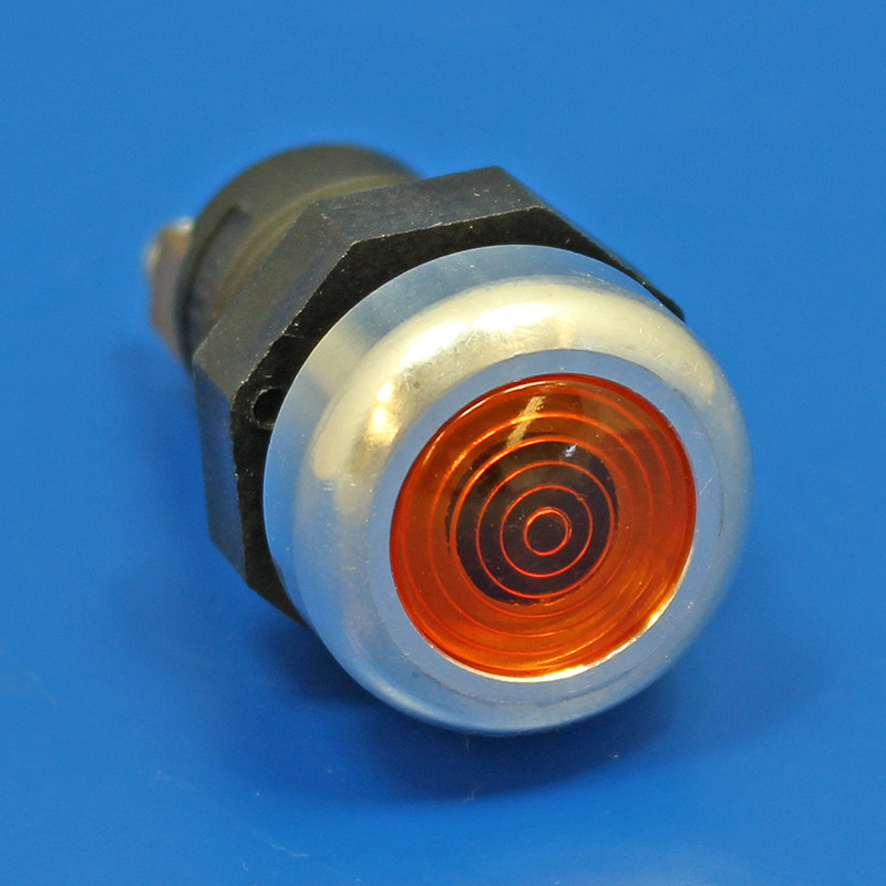 Amber 'Jewel' warning lamp equivalent to Lucas type WL13, as used on a number of high quality vehicles including Aston Martin. Machined aluminium surround complete with WEDGE T10 capless bulb holder ( updated from original) and screw in chrome on brass front bezel with high quality domed glass lens. Requires 10mm (3/8") hole. Supplied without bulb - please order a WEDGE T10 c2W bulb B117A (6V), B510 (12V) or B513 (24V).