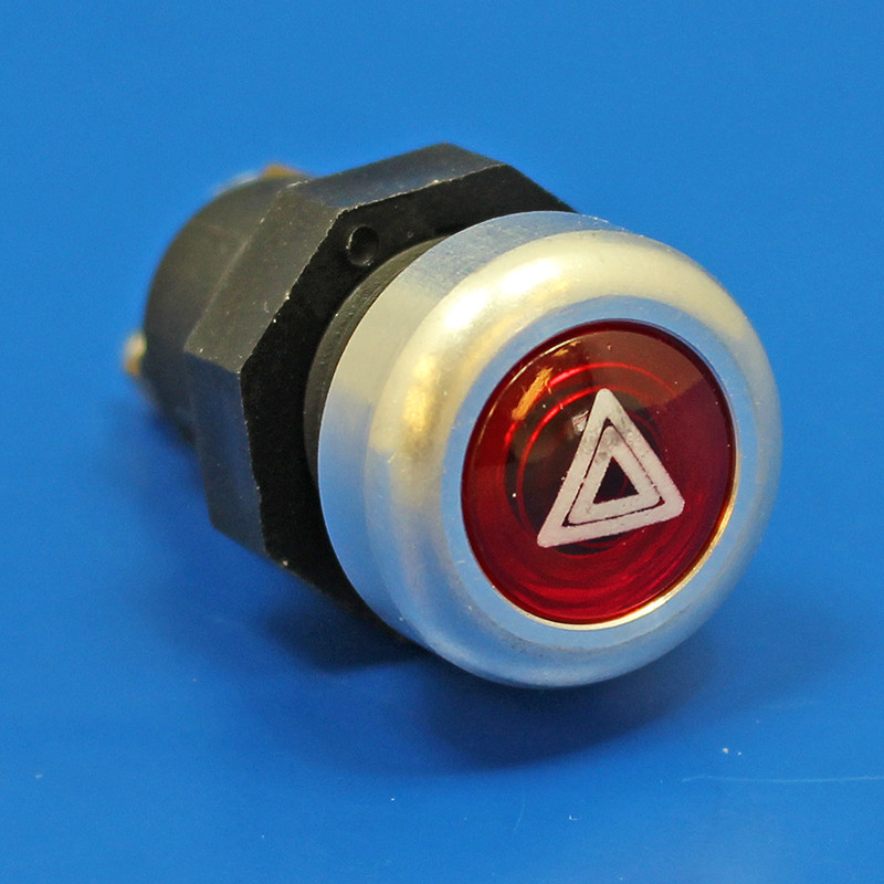 Chrome rimmed panel warning light, red hazard lights. Rim diameter 16mm approx, hole required 12.5mm approx. Fitted with BA7S bulb holder and 12V 2W bulb as standard. 6.3mm push on spade/Lucar rear terminal connections. For replacement/alternative bulbs, please order B282B (6V), B281B (12V) or B283B (24V)