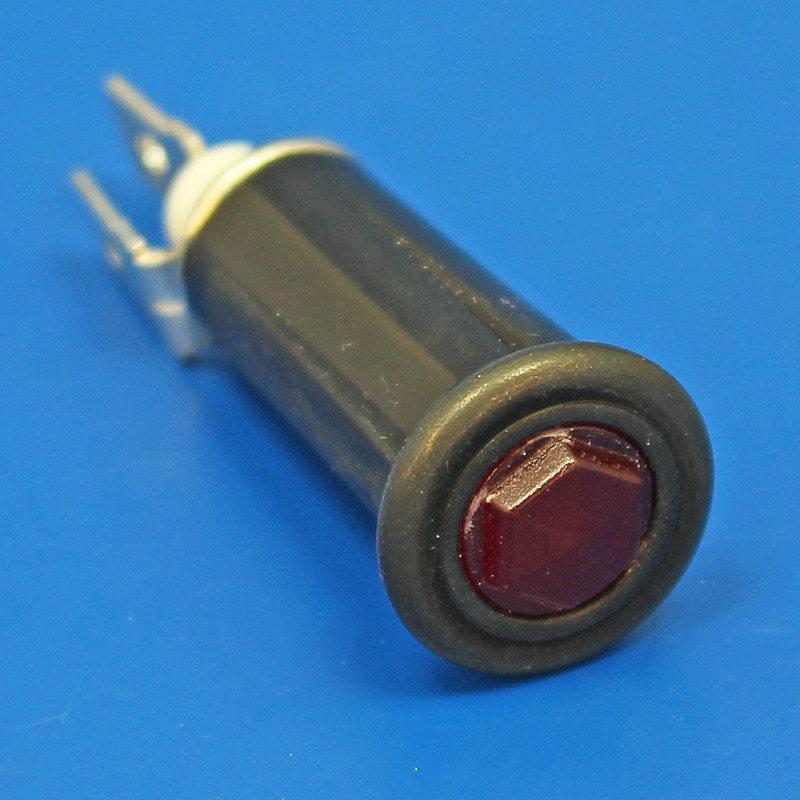 Red 'Jewel' warning lamp equivalent to Lucas type WL13, as used on a number of high quality vehicles including Aston Martin. Machined aluminium surround complete with WEDGE T10 capless bulb holder (updated from original) and screw in chrome on brass front bezel with high quality domed glass lens. Requires 10mm (3/8") hole. Supplied without bulb - please order a WEDGE T10 c2W bulb B117A (6V), B510 (12V) or B513 (24V).