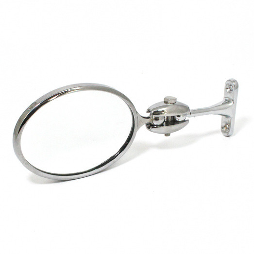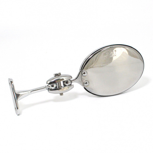 Oval mirror equivalent to the Desmo 263 model. Back of mirror casing embossed Desmo. Convex mirror glass. Suitable for vehicles of the '30's. Head size 110mm x 82mm, overall length 218mm. Complete with extended flat base mounting bracket 70mm long, base 57mm x 14mm, hole centres 38mm approx. Our own manufacture, brass/bronze construction, recreated from an original 'Desmo' mirror pattern, chromium plated finish only. Although these were originally made for right hand mounting, we do offer left hand mounting if specified in the option box.