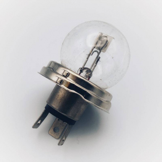 6V bulb rated at 45/40W. Asymmetric UEC P45T base. Clear glass globe 41mm diameter. E marked.