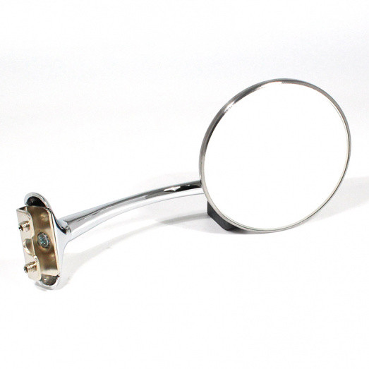 Round mirror with long, curved mounting arm. 4" circular polished stainless steel mirror head with 140mm long curved chrome arm. Adjustable mounting bracket. For mounting on the left or right hand side of the vehicle.