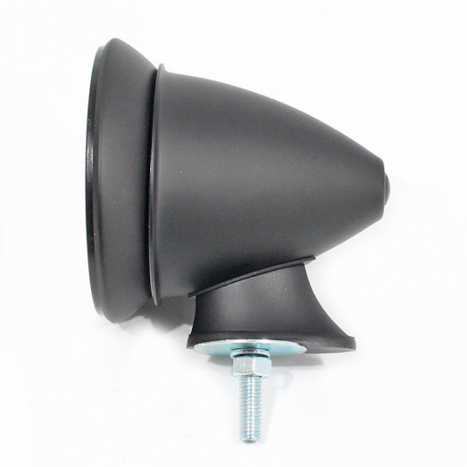 Small bullet/racing mirror with single bolt fixing. All black finish. 4" 100mm diameter overall approximately. FLAT glass lens approx. 3 1/2" (90mm) diameter. M6 mounting stud supplied complete with nut and washer. Adjustable mirror head.