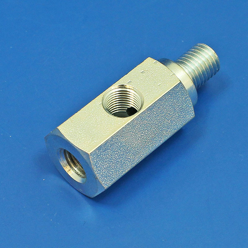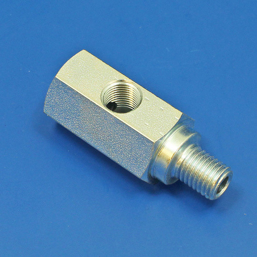 With 3/8" BSF male thread to screw into the oil gallery and the same female thread to take the original transmitter and a female 1/8" NPTF tapping to allow a pressure switch or a 1/8" BSP female pressure gauge line to be attached via adapter OGTPA