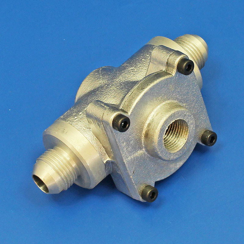 Temperature gauge adaptor with a 5/8" UNF female connection and Dash 8 JIC hose end male connections to take types of capillary gauge (Caerbont, other UK, USA, Japan) for fitting into an oil hose system. Oil hose adapters are two-part aluminium die castings with an O- ring seal.