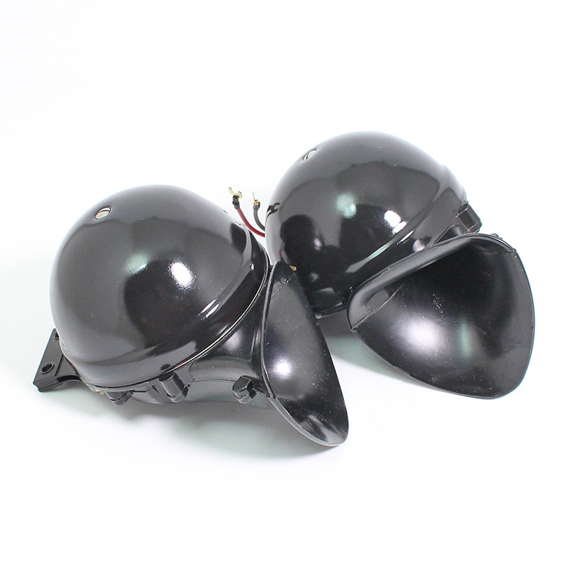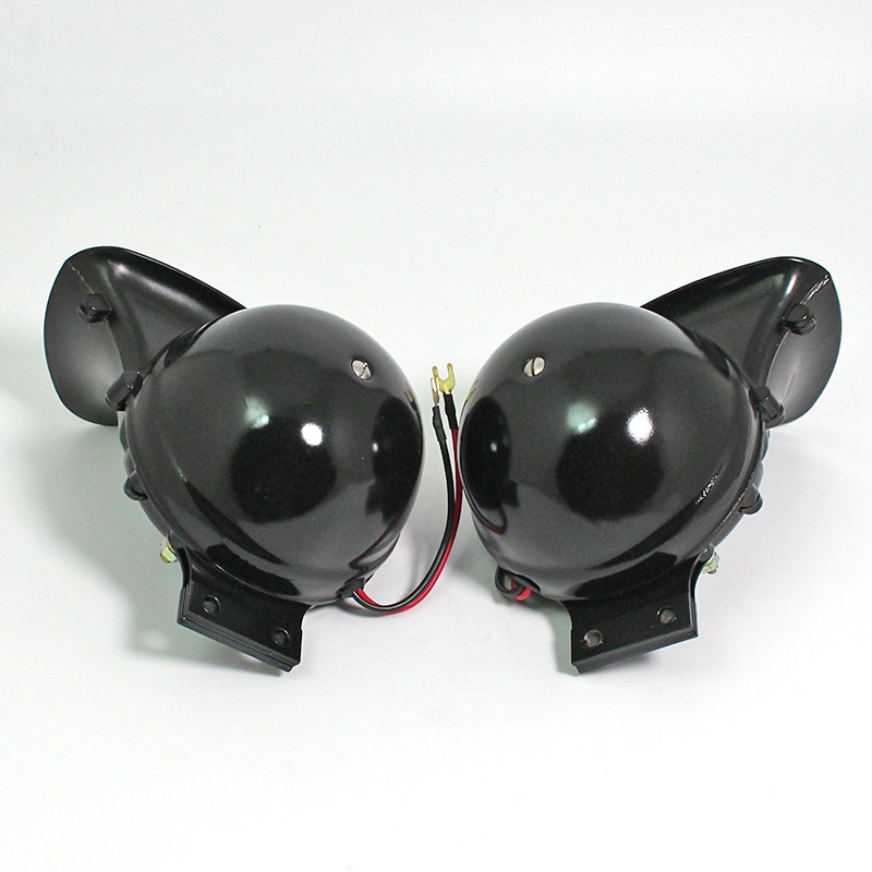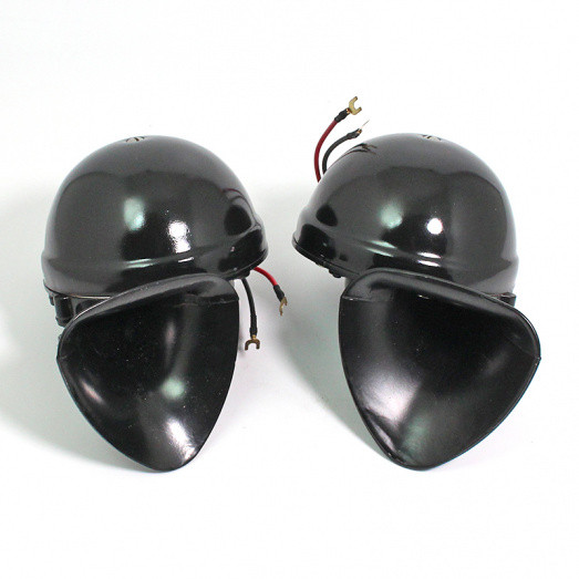 Pair of black Windtone horns giving high and low notes. This type of horn set was fitted to many British cars of the 1940s and 1950s, and provides a robust but musical ''hoot''. A quality reproduction of the original Lucas WT618, under bonnet model of the wind tone horn. Compact, lightweight with a black finish.